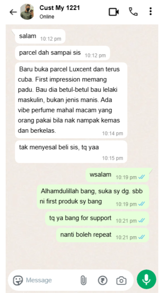 Perfume Luxcent untuk lelaki & wanita yang mahu tampil yakin, memikat dan diingati. Bukan sekadar wangi — ini bau yang meninggalkan kesan dalam ingatan.