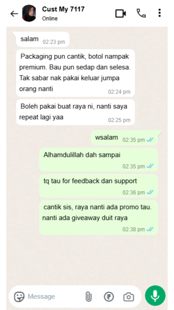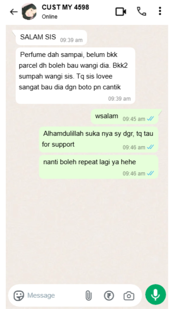 Dirumus Khas Untuk Tarik Perhatian Pasangan Suami Makin Sayang Perfume Terlaris,Terhangat & Paling Meletop Mesra Solat Ketahanan Bau Sehingga 12 Jam Mempunyai bauan yang dapat menarik ‘perhatian’ suami/isteri